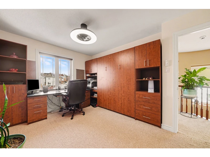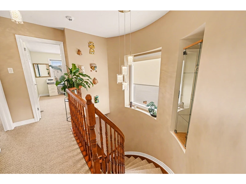 A STRIKING SPIRAL STAIRCASE w/electric blinds & feature niche leads UPSTAIRS to 2 secondary bds perfect as offices yet easily converted for guests w/built-in Murphy beds(great for kids/teens). The SPACIOUS PRIMARY RETREAT comes w/a permanent king-size bed framed by a wall-to-wall blt-in system w/high integrated headboard, deep suit closets, extensive storage, a walk-in closet & LAVISH ENSUITE w/soaker tub & a separate shower.